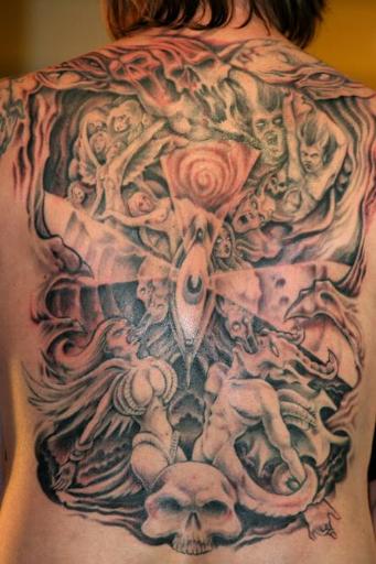 | Dan Leighton, Huber Heights, Ohio Artist: Rev. Chad Wells in Vandalia, Ohio The piece is To represent my Angels and my Demons! It is a Well's Stream of Conscience Tattoo! |
